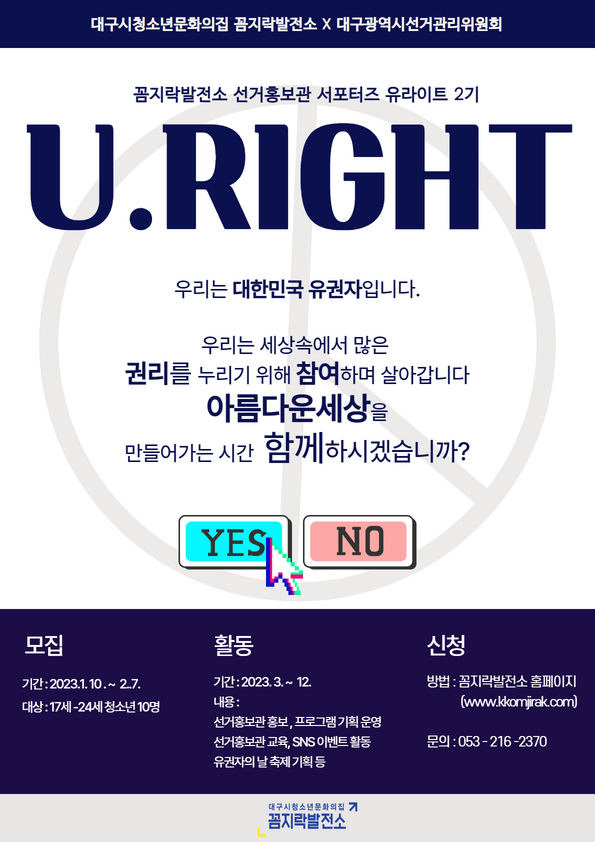 2023 꼼지락발전소 선거홍보관 서포터즈 유라이트 2기 모집작성자 : 최수빈 작성일 : 23-01-20
