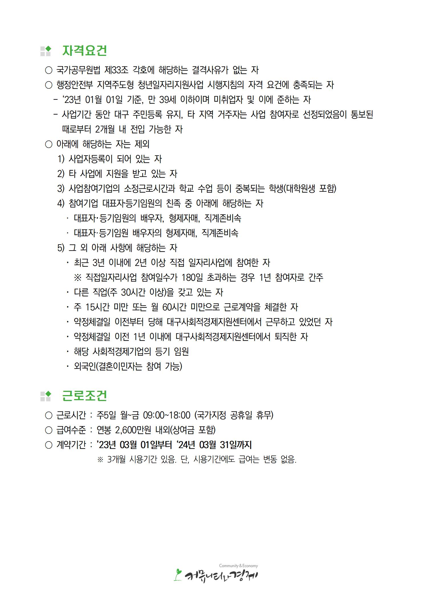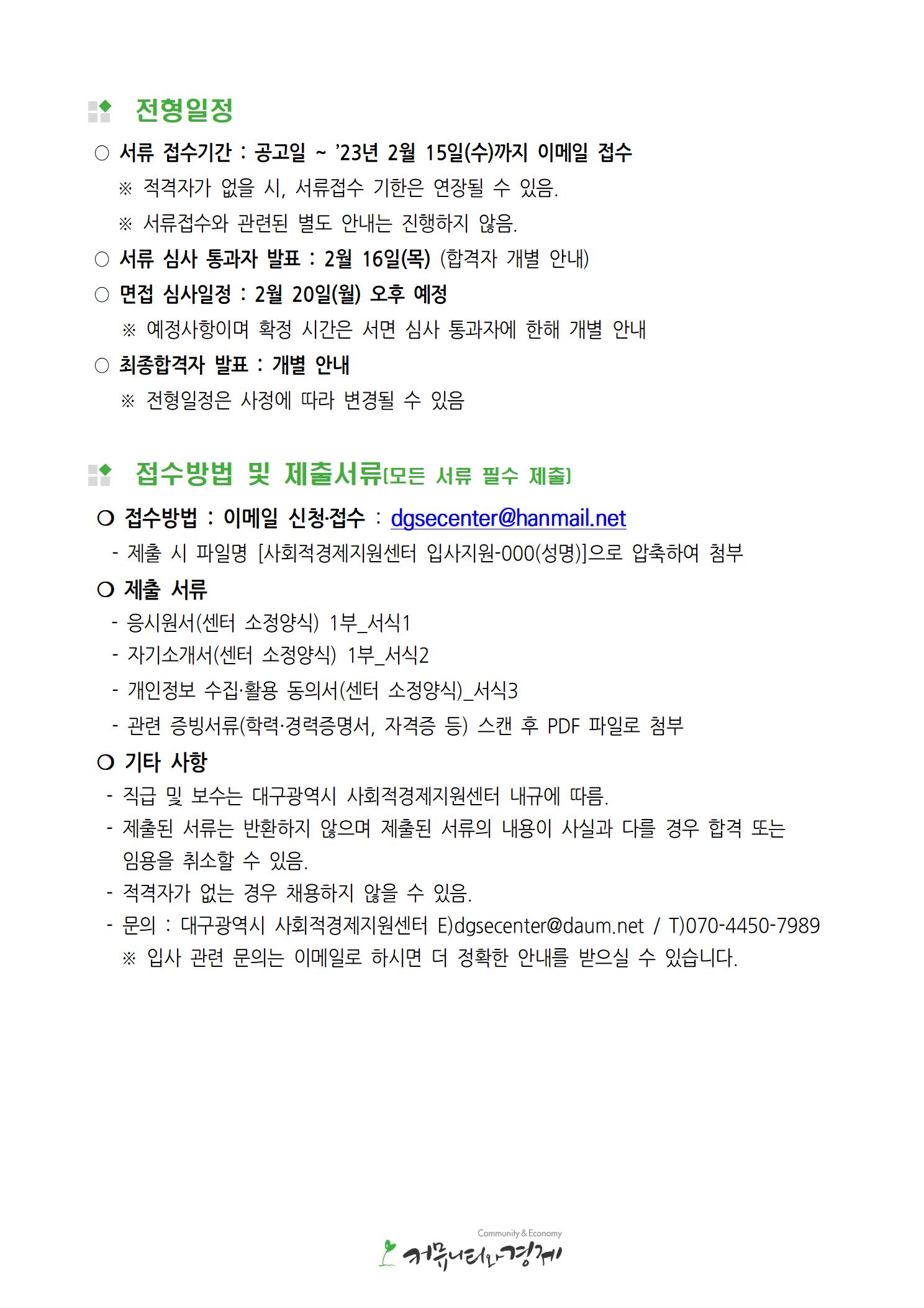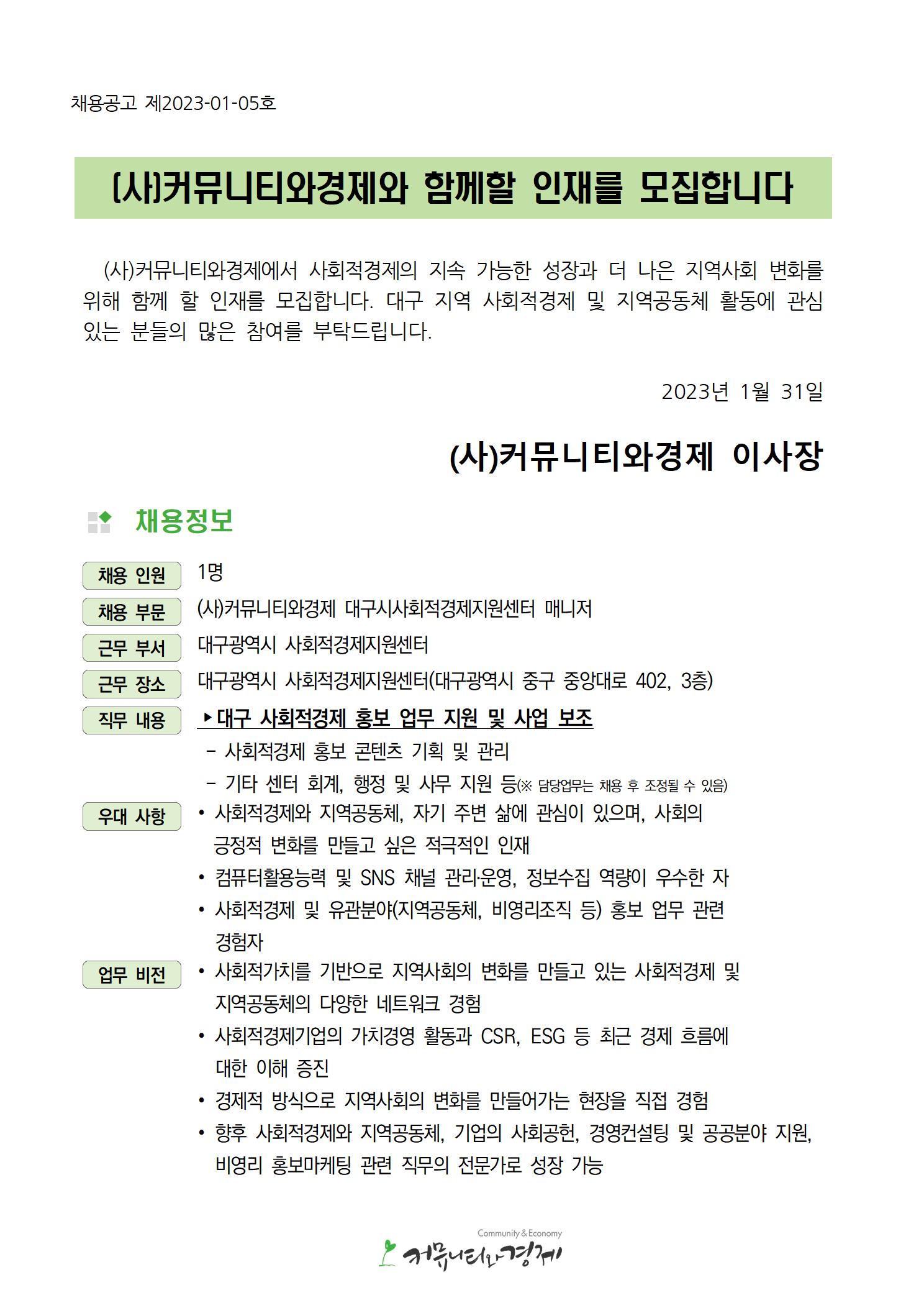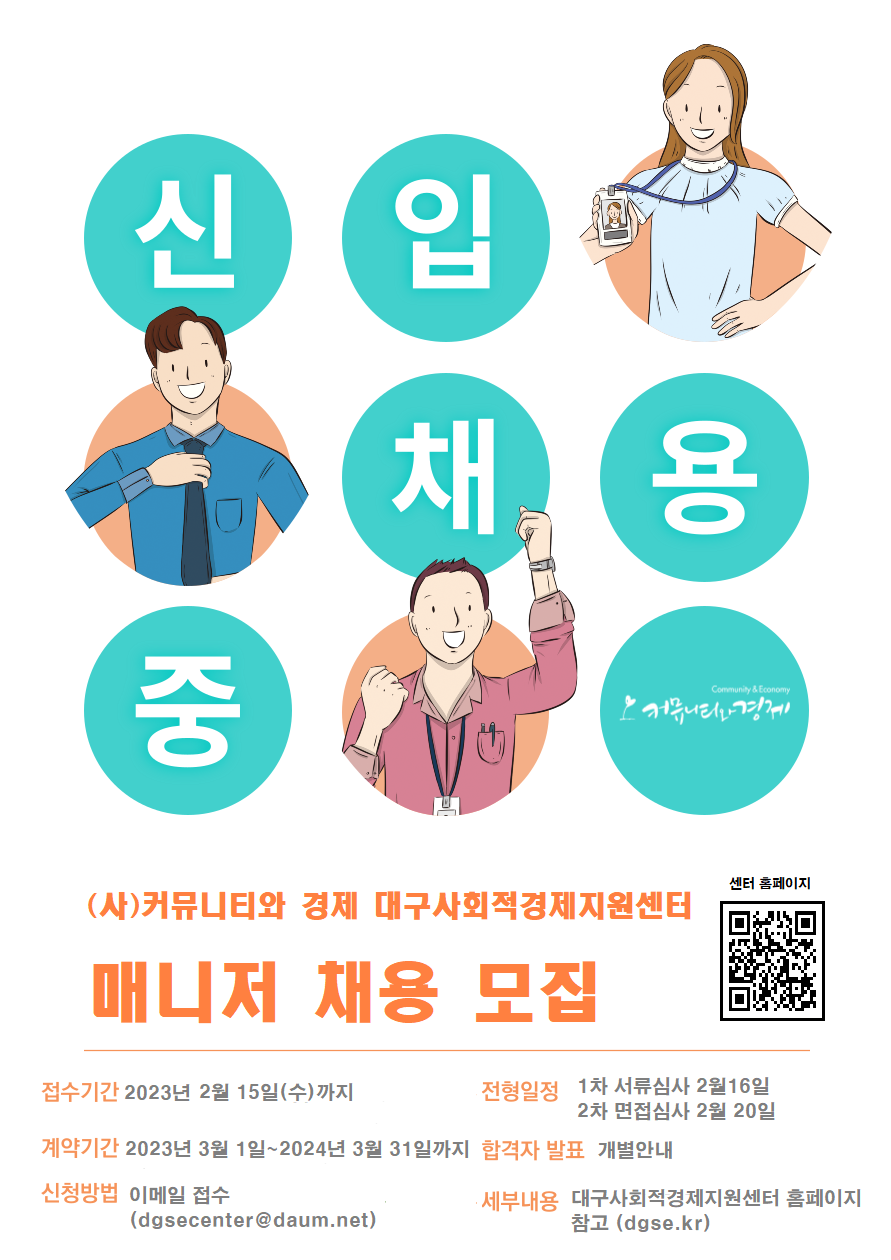 2023년 대구사회적경제지원센터 매니저 채용 (~2/15)작성자 : 김은혜 작성일 : 23-01-31