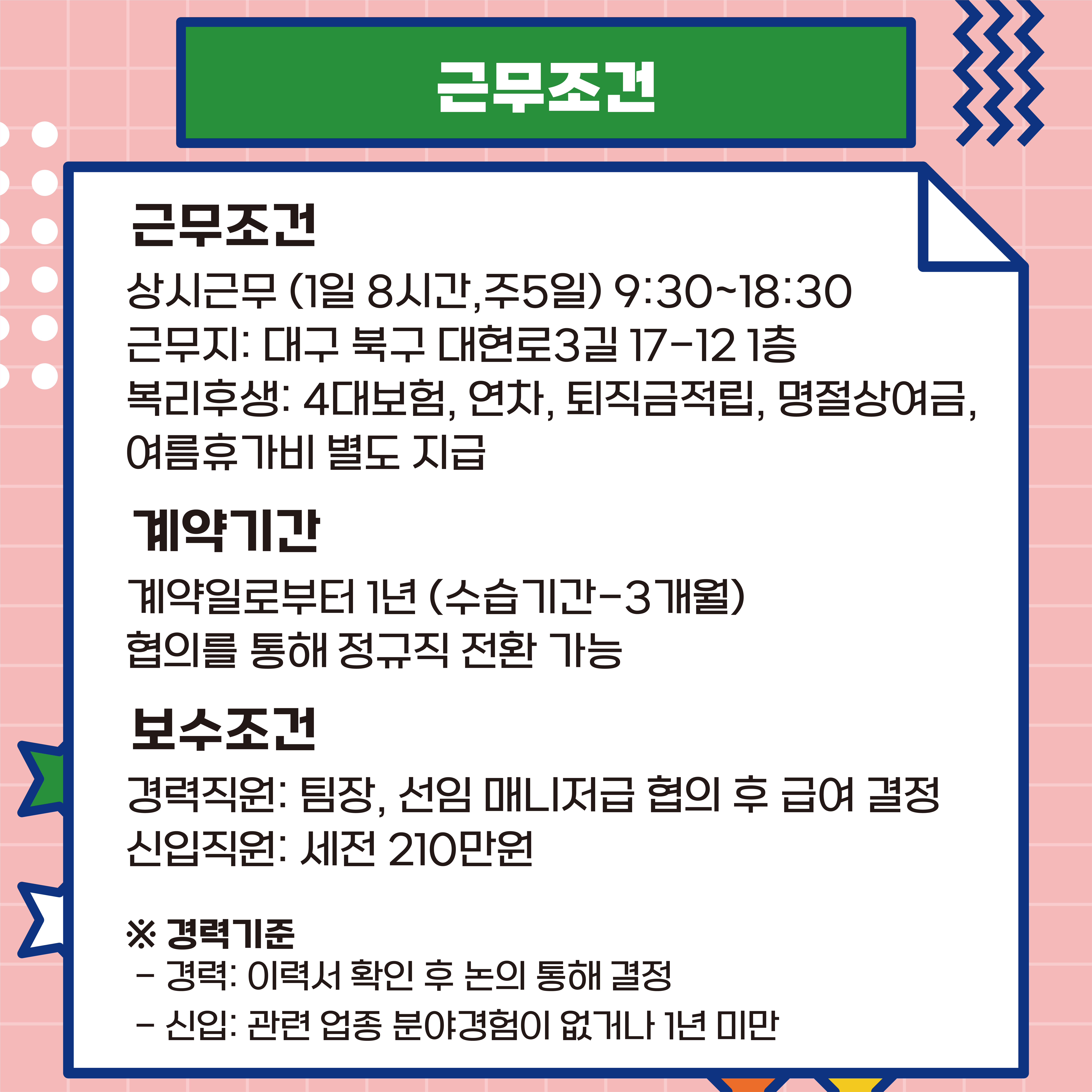 - 급여: 경력직원: 협의 후 결정 / 신입직원: 세전 210만원