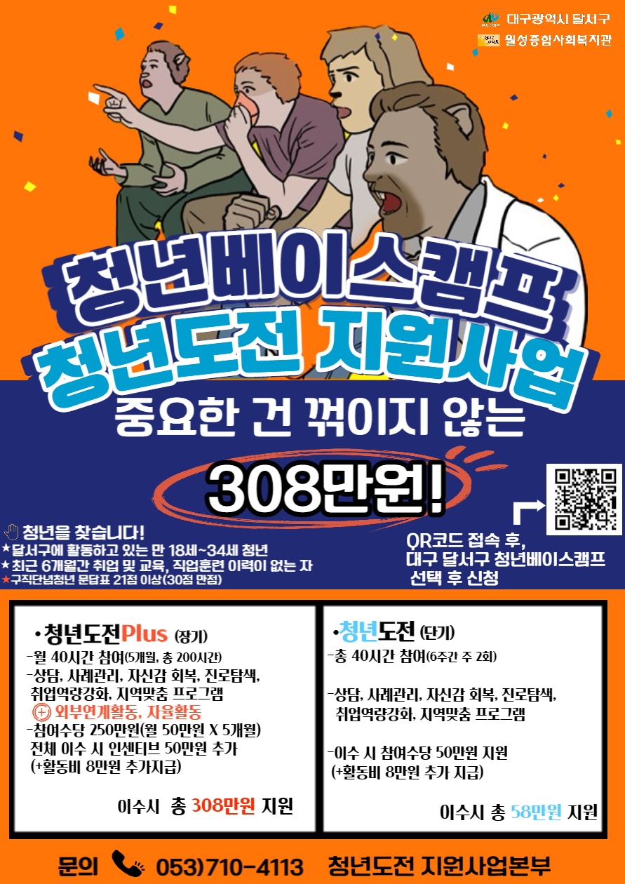 기타 문의 사항은 053-710-4113(청년베이스캠프 청년도전 지원사업 본부)로 언제든 연락주세요~
