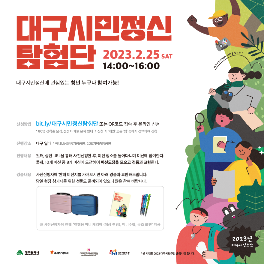 2023년 대구시민주간을 맞아 상상력과 지식을 동원해 미션을 해결하며 대구의 시민정신을 탐험해볼 <대구시민정신 탐험단>을 모집합니다!