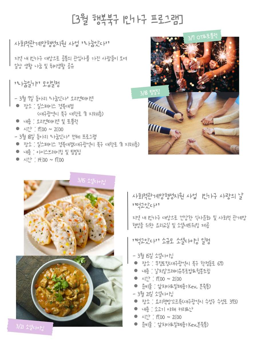 ★2023년 1인가구 사회적 관계망 형성 지원 사업 3월 프로그램 OPEN★작성자 : 홍지우 작성일 : 23-02-22
