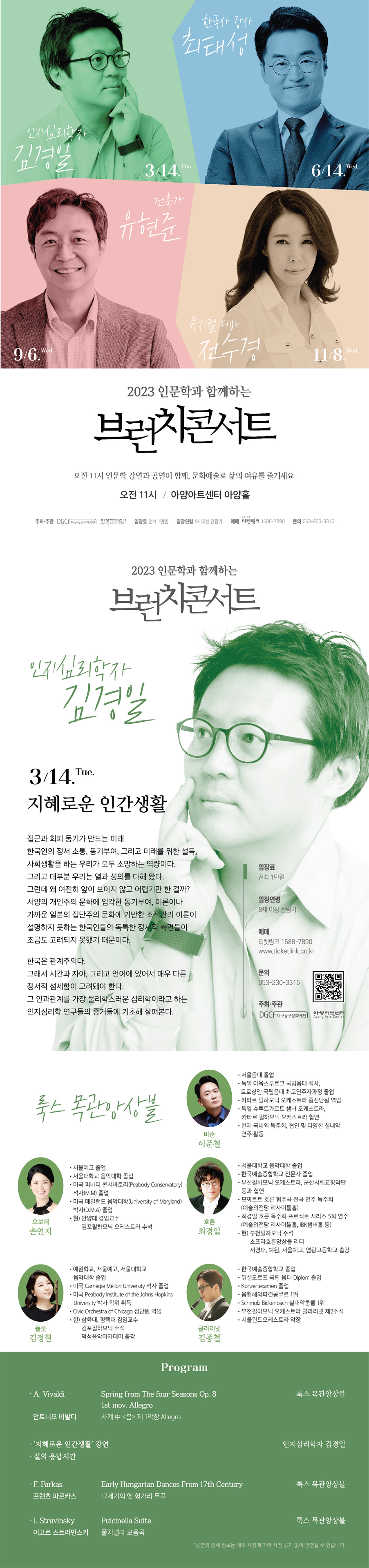 안녕하세요? 저희 동구문화재단 아양아트센터에서는 2023 인문학과 함께하는 브런치콘서트를 진행합니다.