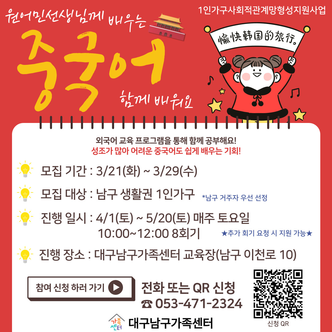 #대구남구가족센터 #1인가구사회관계망지원사업 #1로만난사이 #중국어회화교육