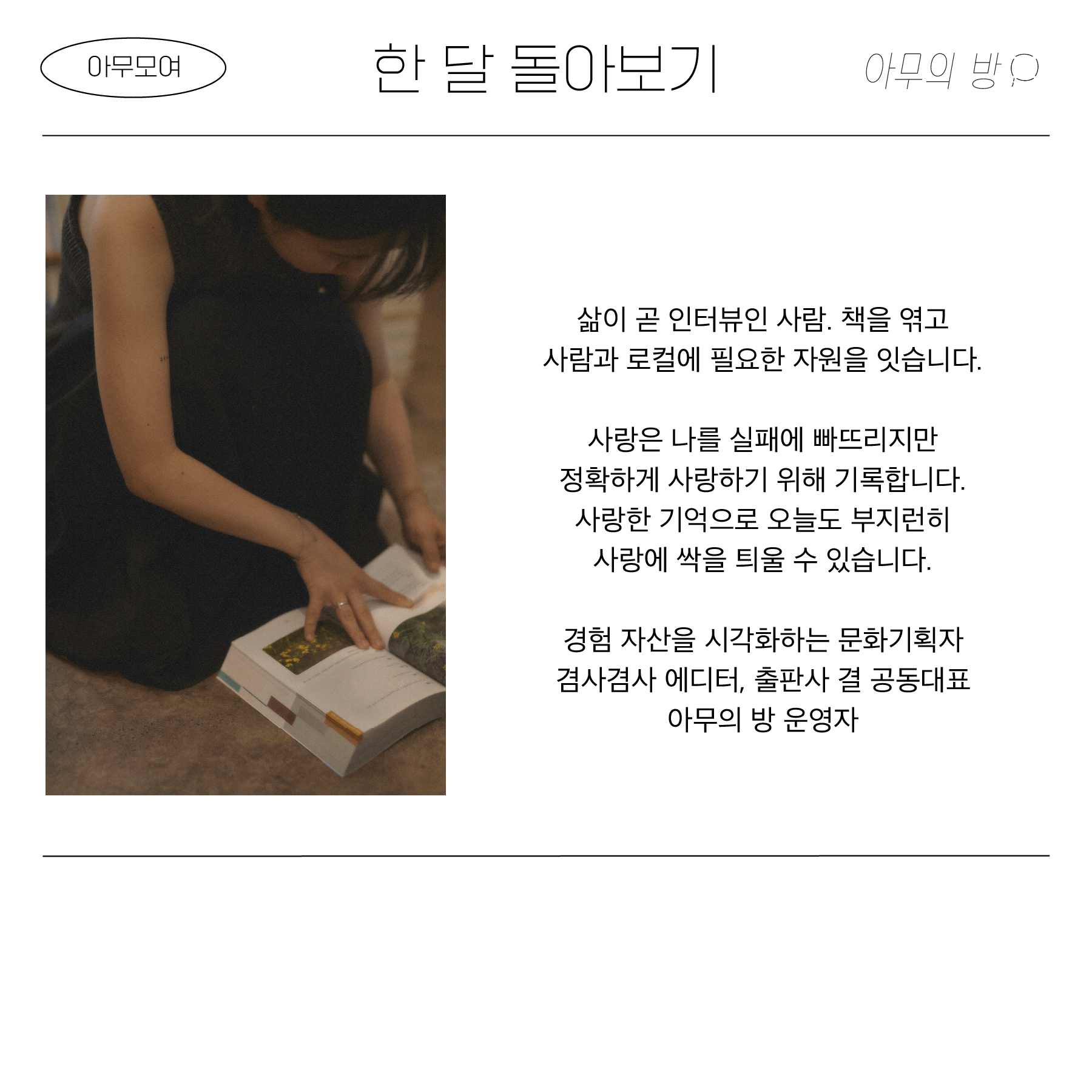 삶이 곧 인터뷰인 사람. 책을 엮고 사람과 로컬에 필요한 자원을 잇습니다. 사랑은 나를 실패에 빠뜨리지만 정확하게 사랑하기 위해 기록합니다. 사랑한 기억으로 오늘도 부지런히 사랑에 싹을 띄울 수 있습니다.