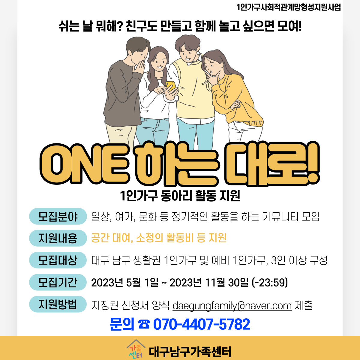 ▶ 신청 및 문의 : ☎070-4407-5782(1인가구) / ☎053-475-2324