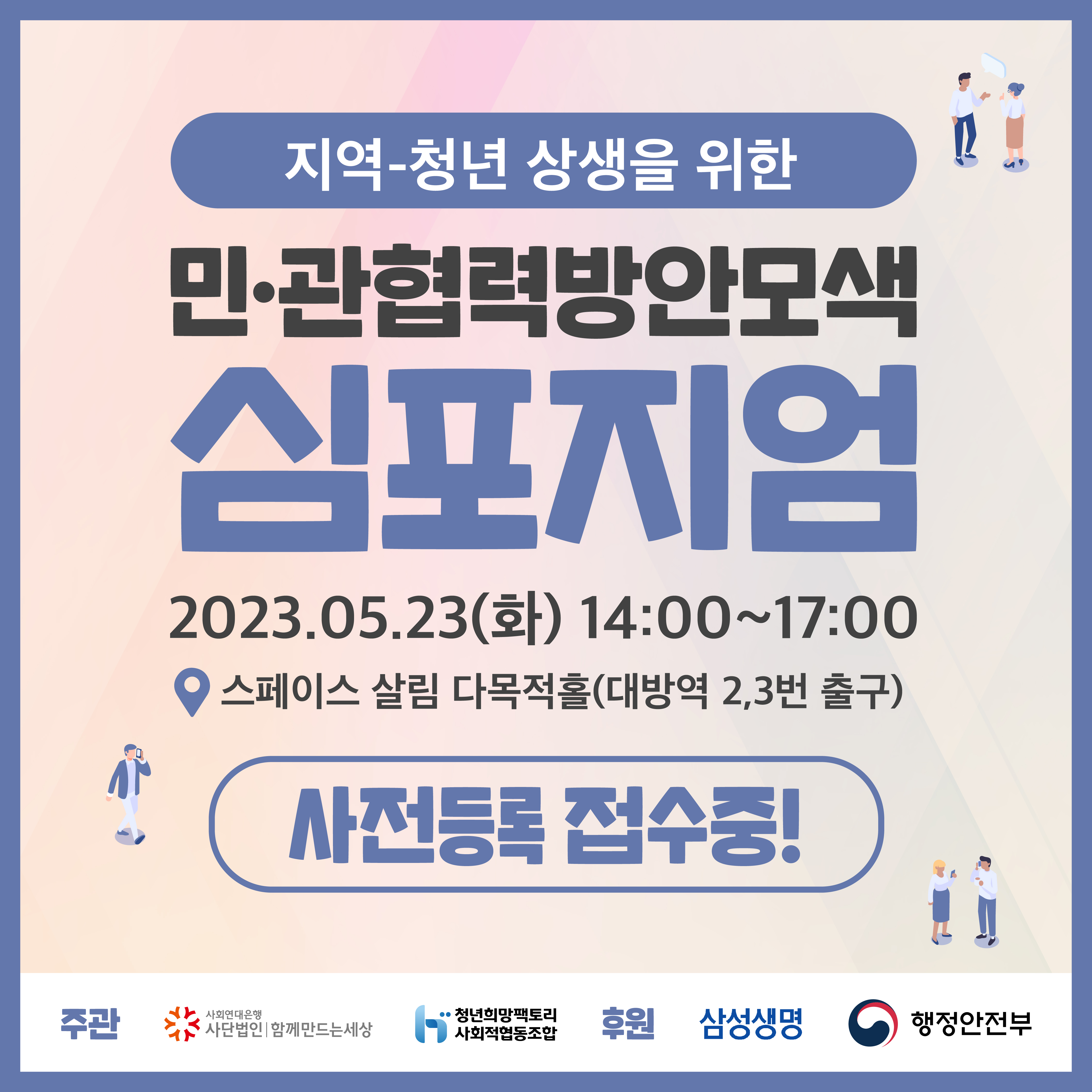 【⭐ 𝑩𝒐𝒐𝒔𝒕 𝒀𝒐𝒖𝒓 𝑳𝒐𝒄𝒂𝒍 : 지역-청년 상생을 위한 민관협력방안 모색 심포지엄 ⭐】 참여 모집작성자 : 청년희망팩토리 작성일 : 23-05-15
