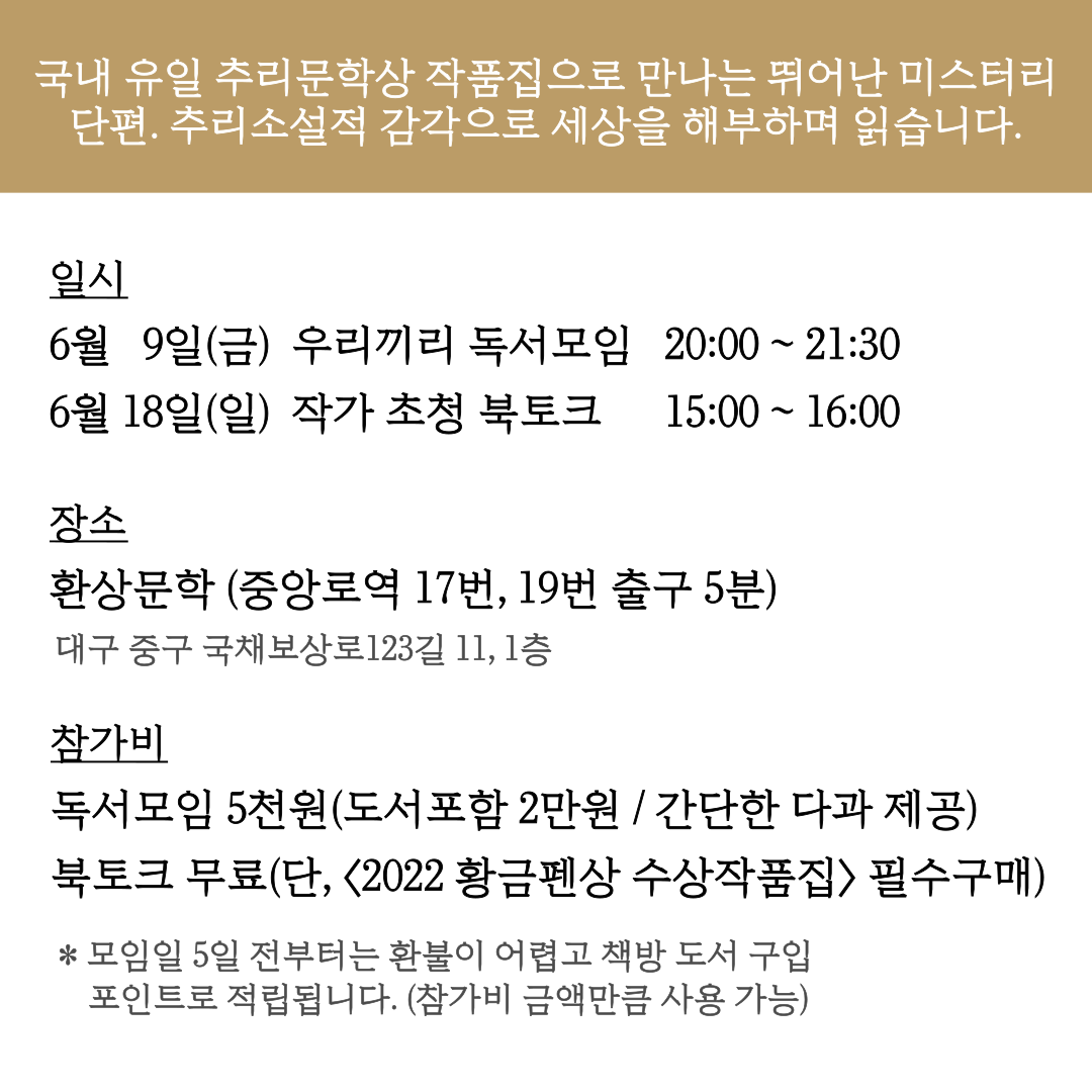 📚 한 달 동안 북클럽과 작가 초청 북토크를 통해 <한국추리문학상 황금펜상 수상작품집 2022>를 읽은 이야기를 나눕니다.