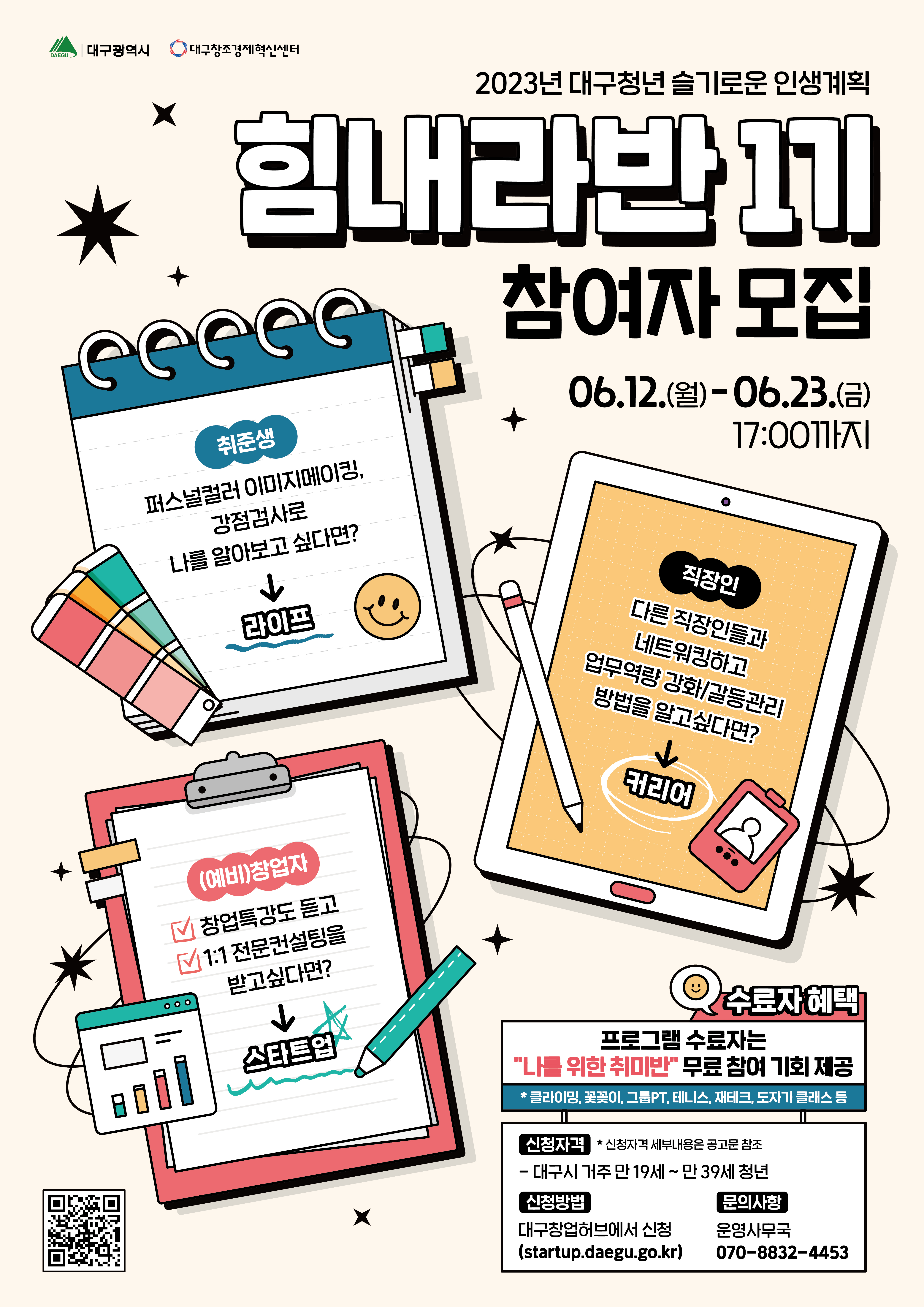 2023년 「대구청년 슬기로운 인생계획 지원사업」 힘내라반(1기) 참여청년 모집작성자 : 김아름 작성일 : 23-06-12