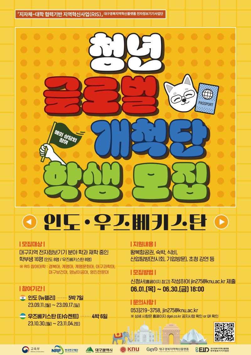 「지자체-대학 협력기반 지역혁신(RIS) 사업」의 일환으로 "청년 글로벌 개척단(인도, 우즈베키스탄) 사업"을 시행하오니 관심 있는 전자정보기기 분야 학생들의 많은 참여 바랍니다.