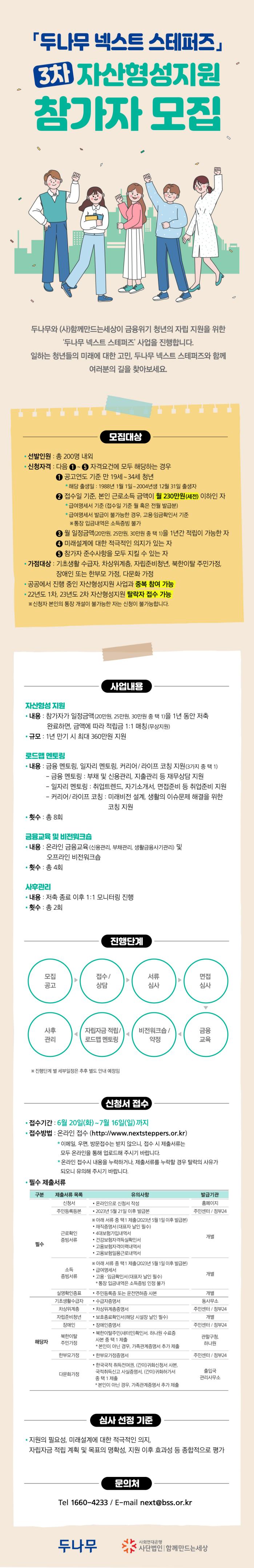 (사)함께만드는세상 [두나무 넥스트 스테퍼즈] 3차 자산형성지원 참가자 모집 안내(~7/16)작성자 : 이경민 작성일 : 23-06-21