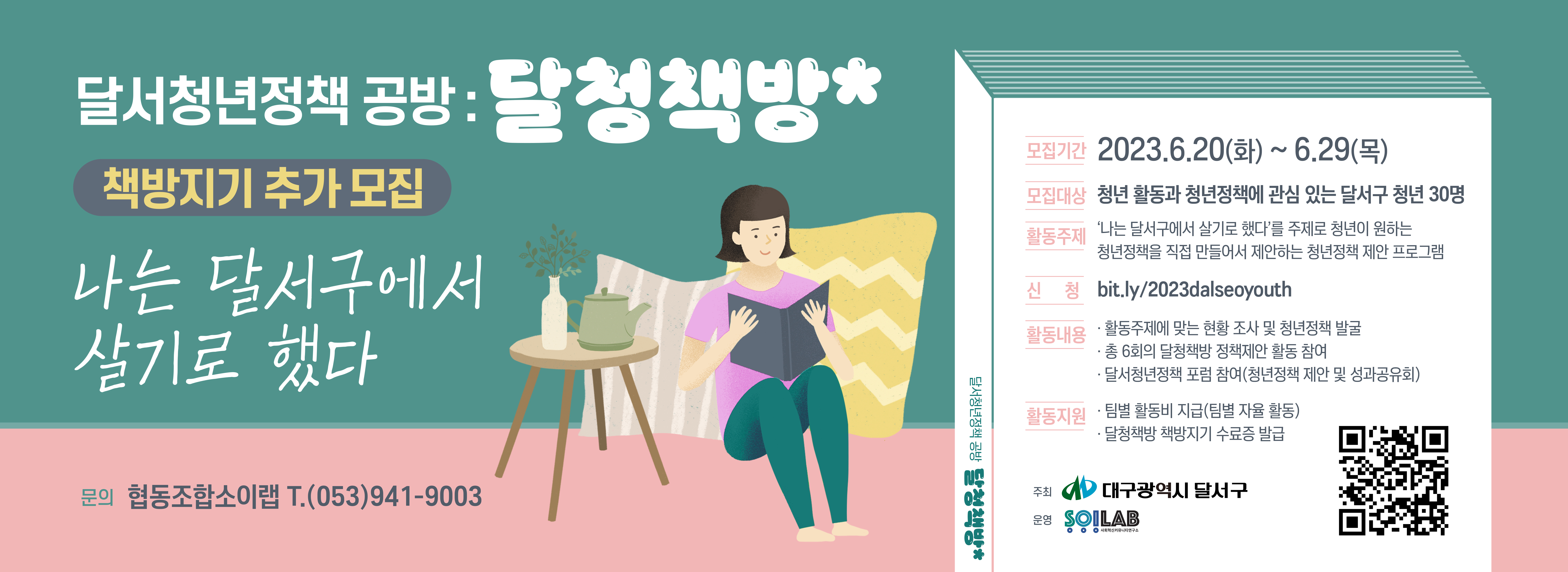 [달서청년정책 공방 : 달청책방] 책방지기 모집🙋♂️🙋♀️작성자 : 협동조합소이랩 작성일 : 23-06-21