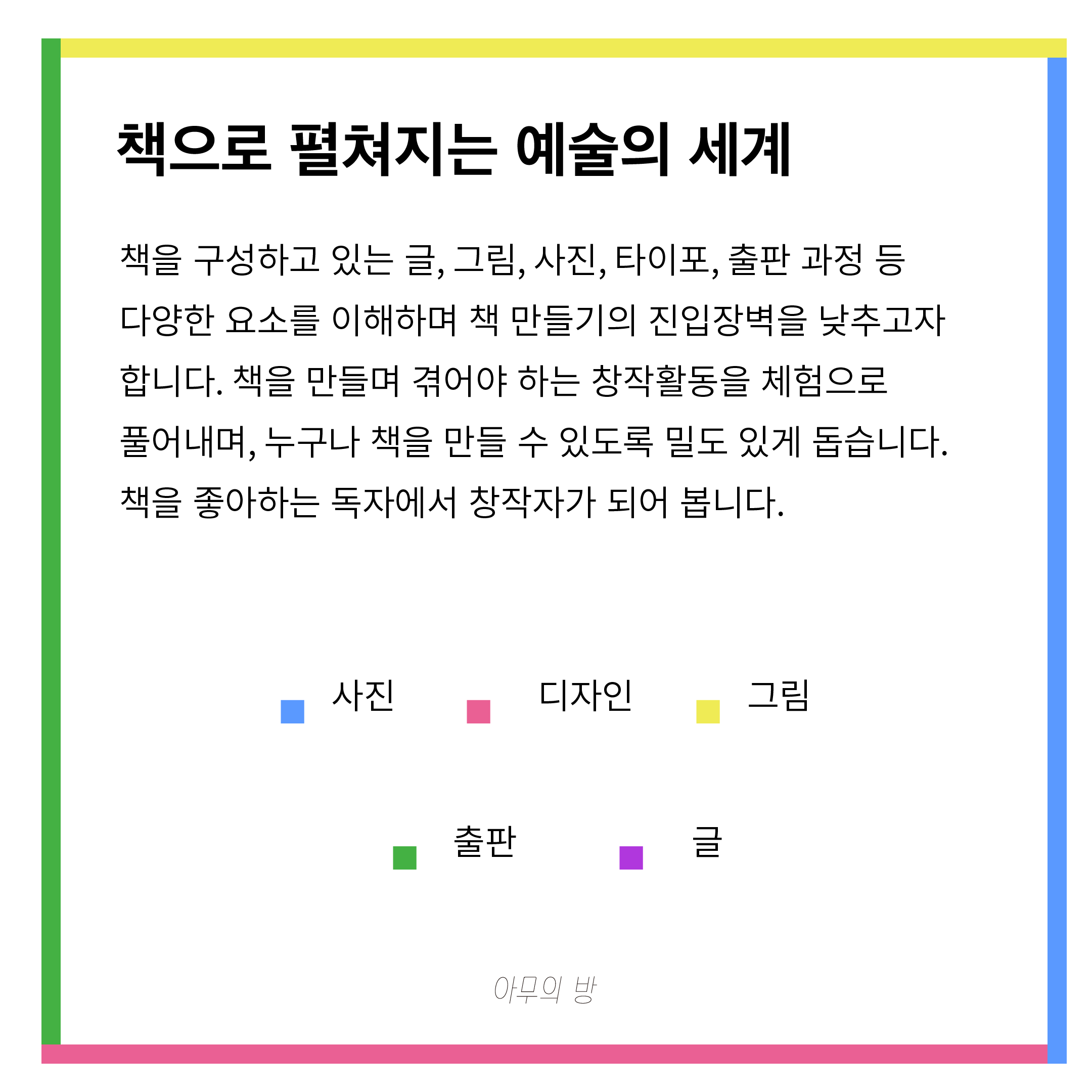 <책으로 펼쳐지는 예술의 세계>는 책을 구성하고 있는 글, 그림, 사진, 타이포, 출판 과정 등 다양한 요소를 이해하며 책 만들기의 진입장벽을 낮추고자 합니다. 책을 만들며 겪어야 하는 창작활동을 체험으로 풀어내며, 누구나 책을 만들 수 있도록 밀도 있게 돕습니다.