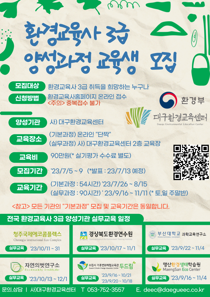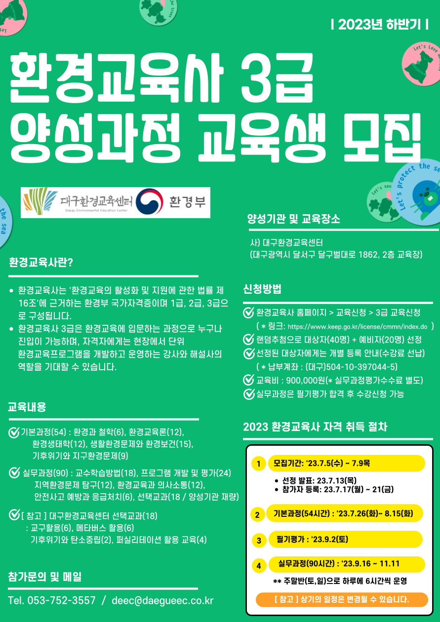 2023 하반기 환경교육사 3급 교육생 모집작성자 : 임호영 작성일 : 23-06-28