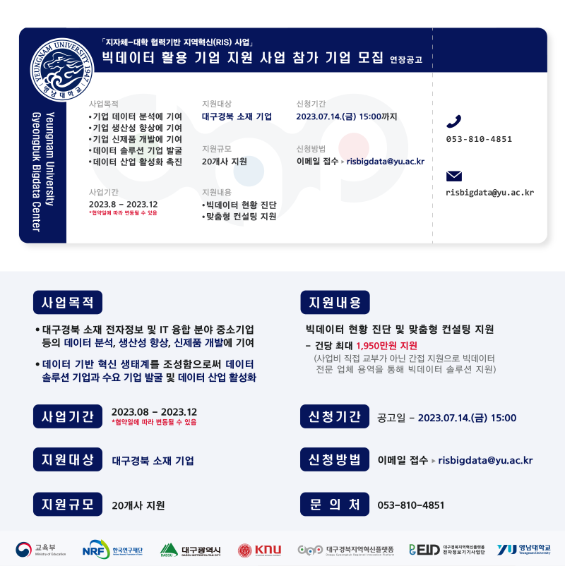 「지자체-대학 협력기반 지역혁신(RIS) 사업」의 일환으로 "빅데이터 활용 기업 지원 사업"을 시행하오니 관심 있는 대구경북 소재 기업들의 많은 참여 바랍니다.