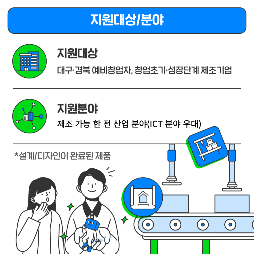 대구·경북 소재의 예비창업자, 창업 초기·성장단계 제조기업에 계시는 분들의 빠른 제품화 및 사업화를 지원해드리고 있습니다!