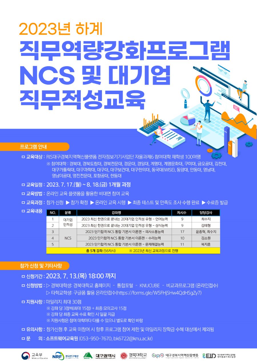 2023년 하계 직무 역량 강화 프로그램 NCS 및 대기업 직무 적성 교육 수강생 모집 (~7/13)작성자 : 이지현 작성일 : 23-07-05