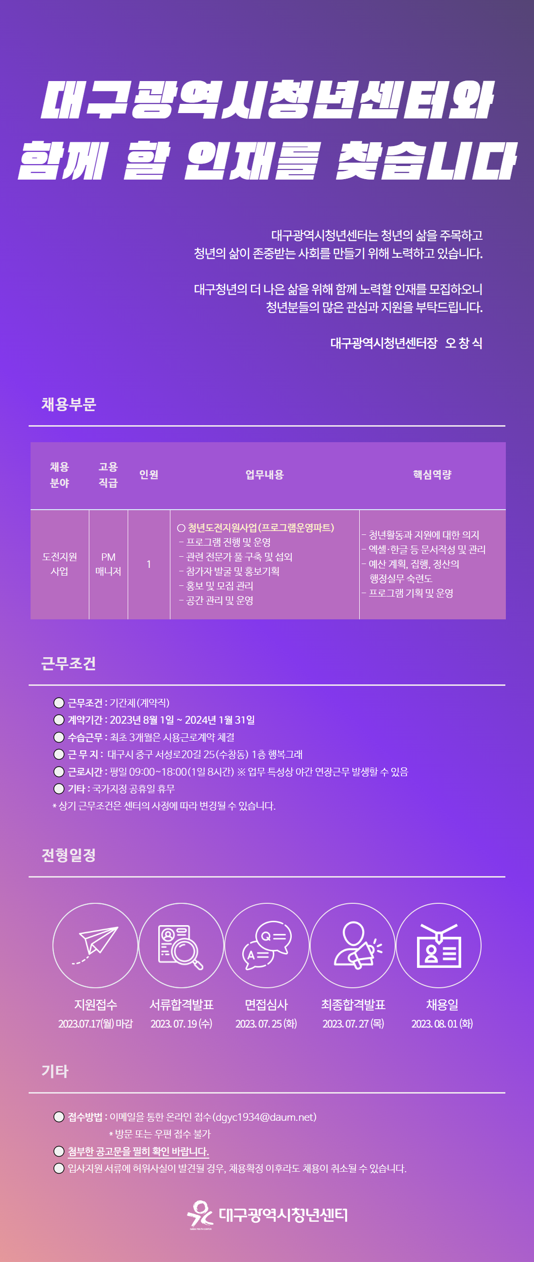 대구광역시청년센터 인재채용 공고 [제2023-04호]작성자 : 대구청년센터 작성일 : 23-07-07 대구광역시청년센터