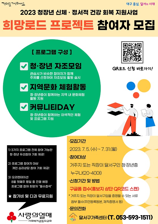 거주지 또는 직장이 달서구인 청장년층(20-40대)이 함께하는 ‘희망로드 프로젝트’ 참여자를 모집합니다.