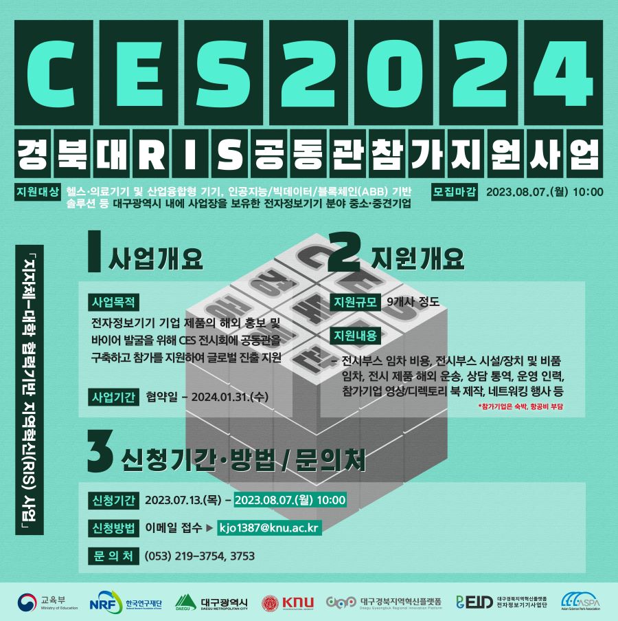 「지자체-대학 협력기반 지역혁신(RIS) 사업」의 일환으로 "CES 2024 경북대 RIS 공동관 참가 지원 사업"을 시행하오니 관심 있는 전자정보기기 분야 기업들의 많은 참여 바랍니다.