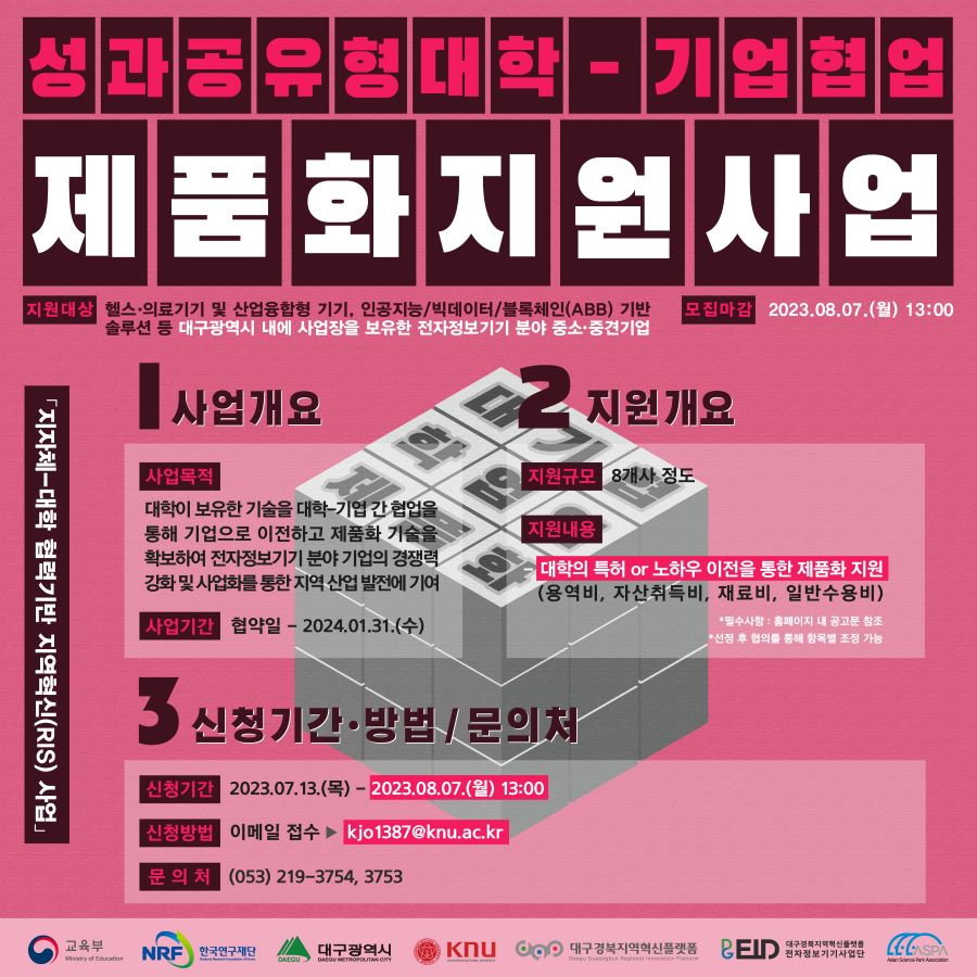 성과공유형 대학-기업 협업 제품화 지원 사업 참가 기업 모집 (~8/7)작성자 : 이지현 작성일 : 23-07-18