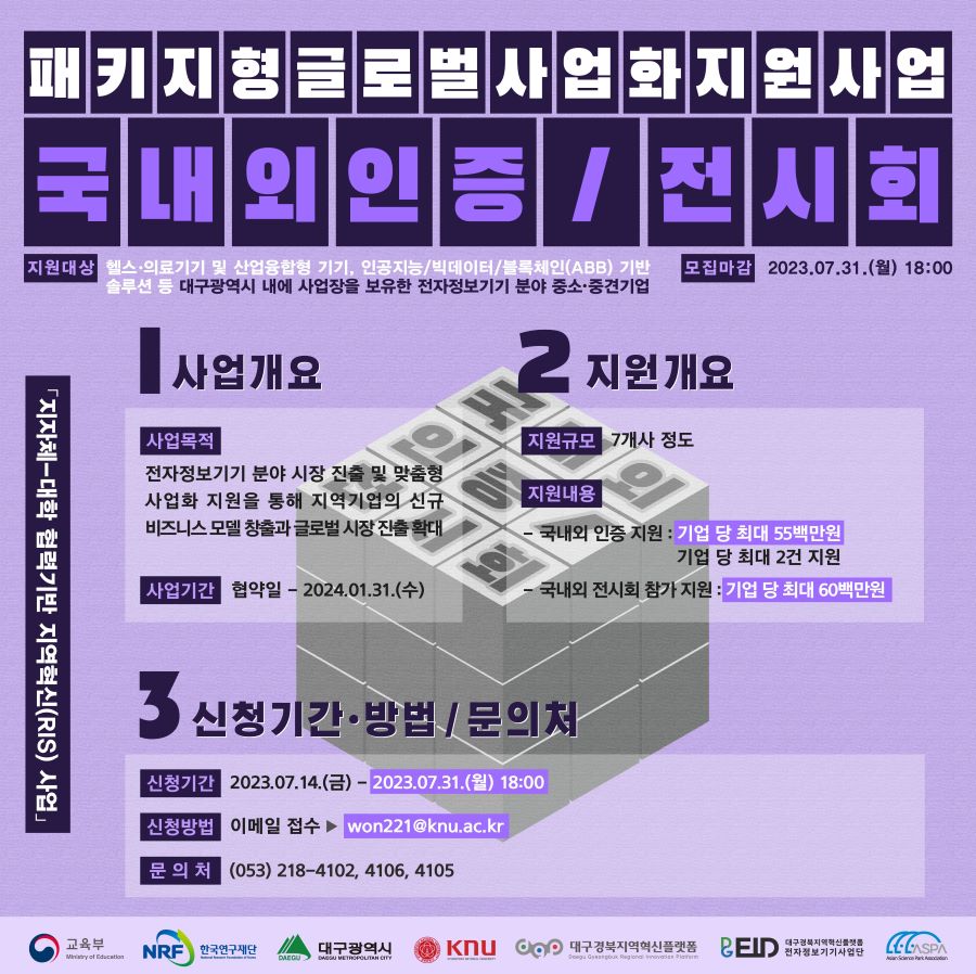 패키지형 글로벌 사업화 지원 사업 - 국내외 인증, 전시회 참가 기업 모집 (~7/31)작성자 : 이지현 작성일 : 23-07-19