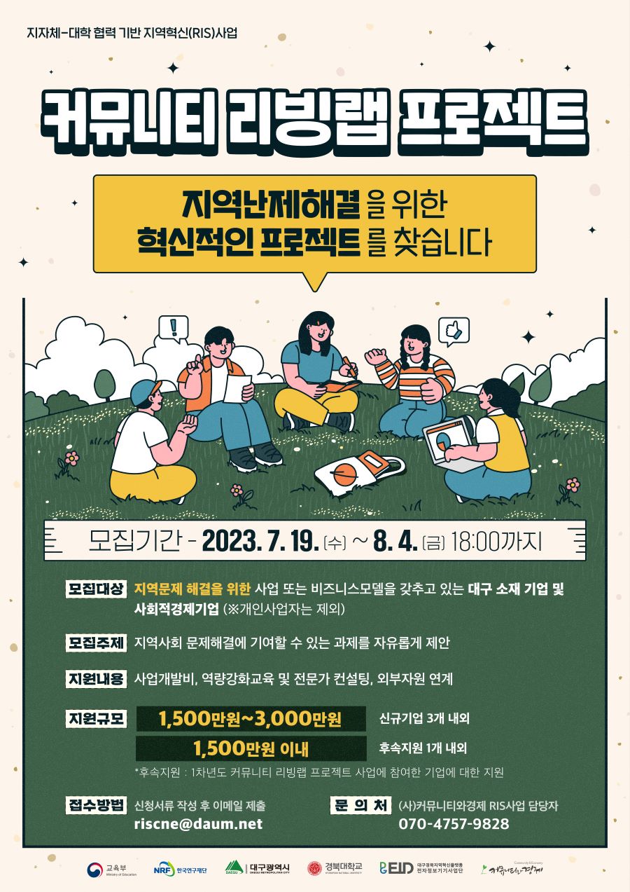 「지자체-대학 협력기반 지역혁신(RIS) 사업」의 일환으로 "2023 커뮤니티 리빙랩 프로젝트"를 시행하오니 관심 있는 대구 소재 기업들의 많은 참여 바랍니다.