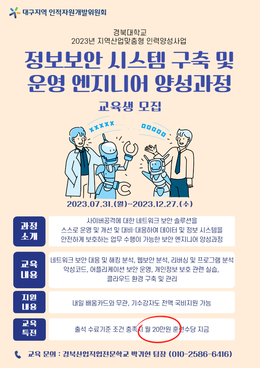 정보보안 시스템 구축 및 운영 엔지니어 양성과정 모집작성자 : 관리자 작성일 : 23-07-26