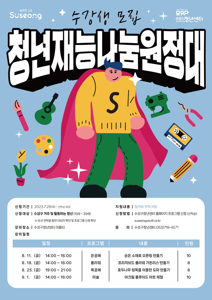수성구청년센터 8월 청년재능나눔원정대 모집작성자 : 수성구청년센터 작성일 : 23-07-28
