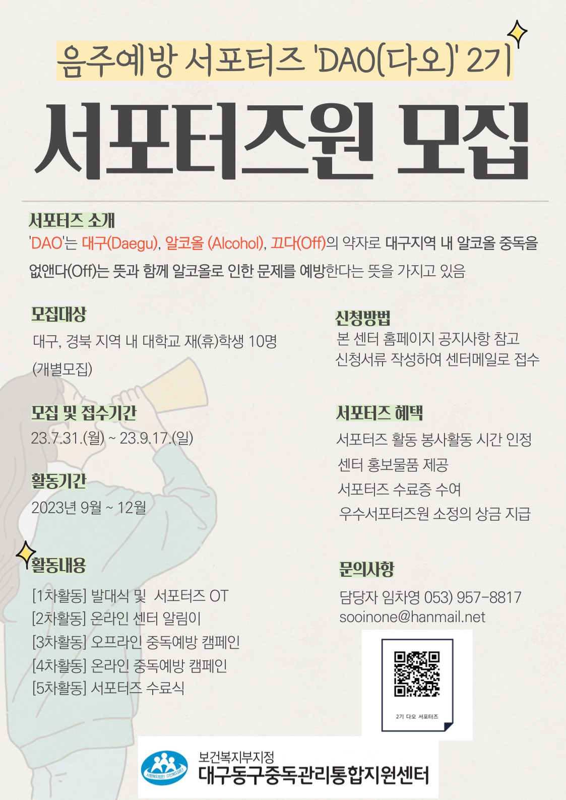 2023년 음주문제예방 서포터즈 'DAO(다오)'2기 모집작성자 : 임차영 작성일 : 23-07-31