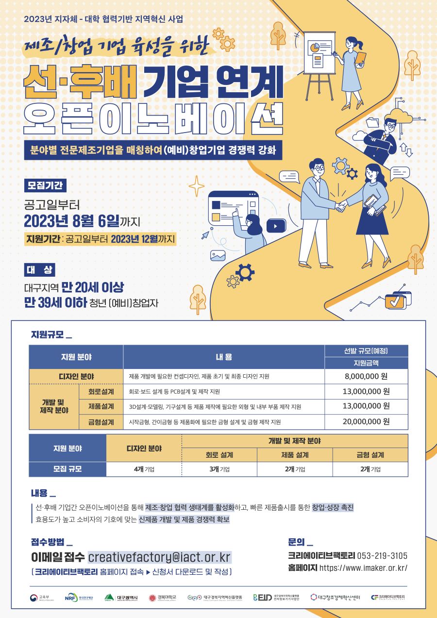 「지자체-대학 협력기반 지역혁신(RIS) 사업」의 일환으로 "선·후배 기업 연계 오픈 이노베이션"을 시행하오니 관심 있는 대구 거주 청년 (예비)창업자들의 많은 참여 바랍니다.