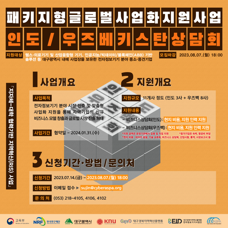 패키지형 글로벌 사업화 지원 사업 - 인도, 우즈베키스탄 상담회 참가 기업 모집 (~8/7)작성자 : 이지현 작성일 : 23-08-01