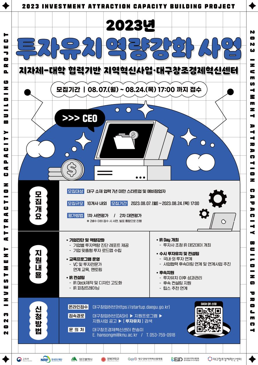 「지자체-대학 협력기반 지역혁신(RIS) 사업」의 일환으로 "2023 투자유치 역량 강화 사업"을 시행하오니 관심 있는 대구 소재 업력 7년 미만 스타트업 및 예비 창업자분들의 많은 참여 바랍니다.