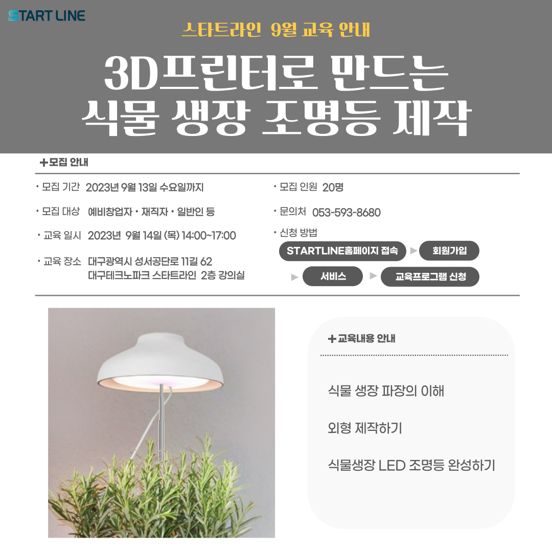 📢메이커스페이스 전문랩 스타트라인에서 ' 3D프린터로 만드는 식물 생장 조명등 제작' 교육을 진행합니다!