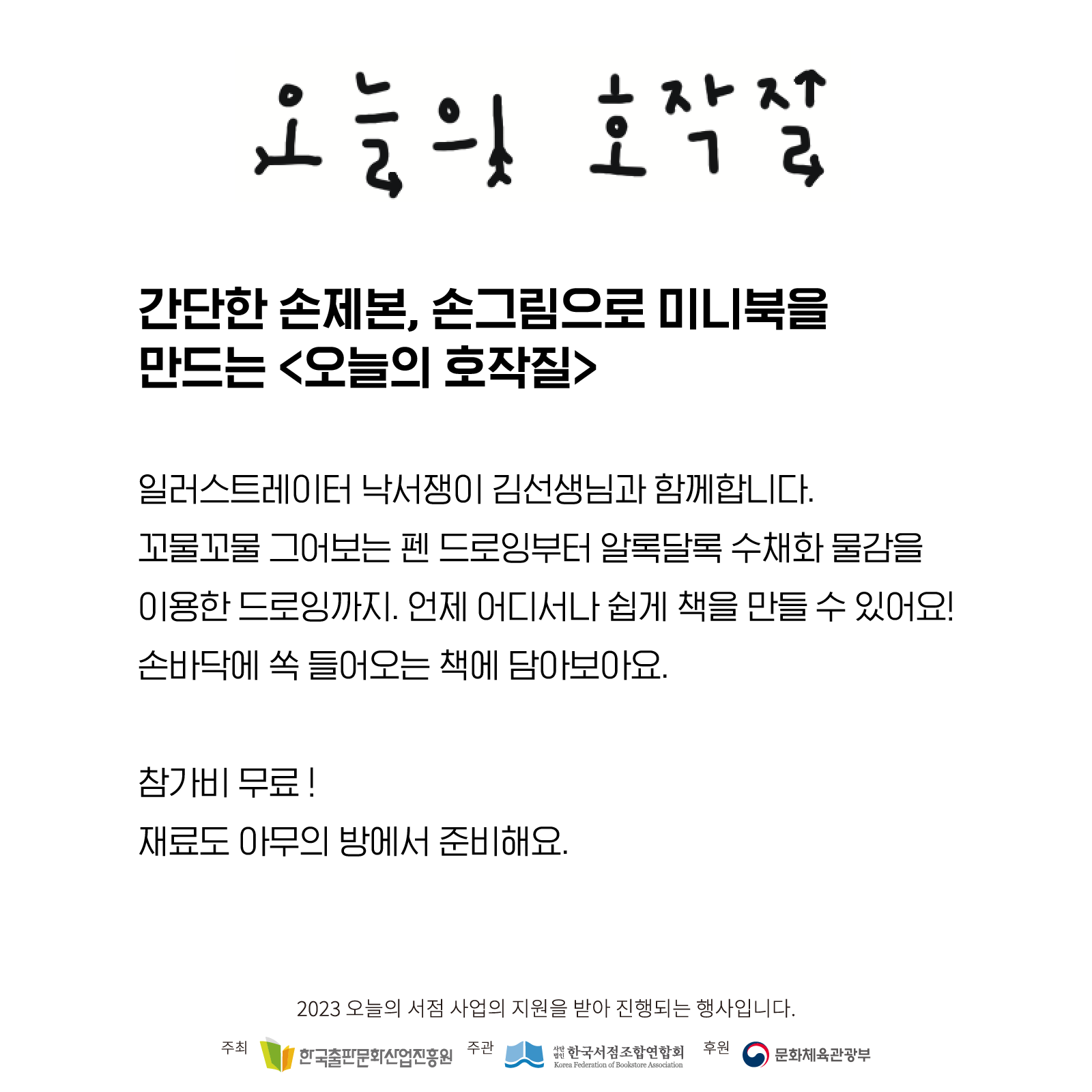 일러스트레이터 낙서쟁이 김선생( @nurimcrystal ) 님과 함께합니다. 꼬물꼬물 그어보는 펜 드로잉부터 알록달록 수채화 물감을 이용한 드로잉까지 기초를 알려드려요. 언제 어디서나 쉽게 책을 만들 수 있어요! 손바닥에 쏙 들어오는 책에 담아보아요.