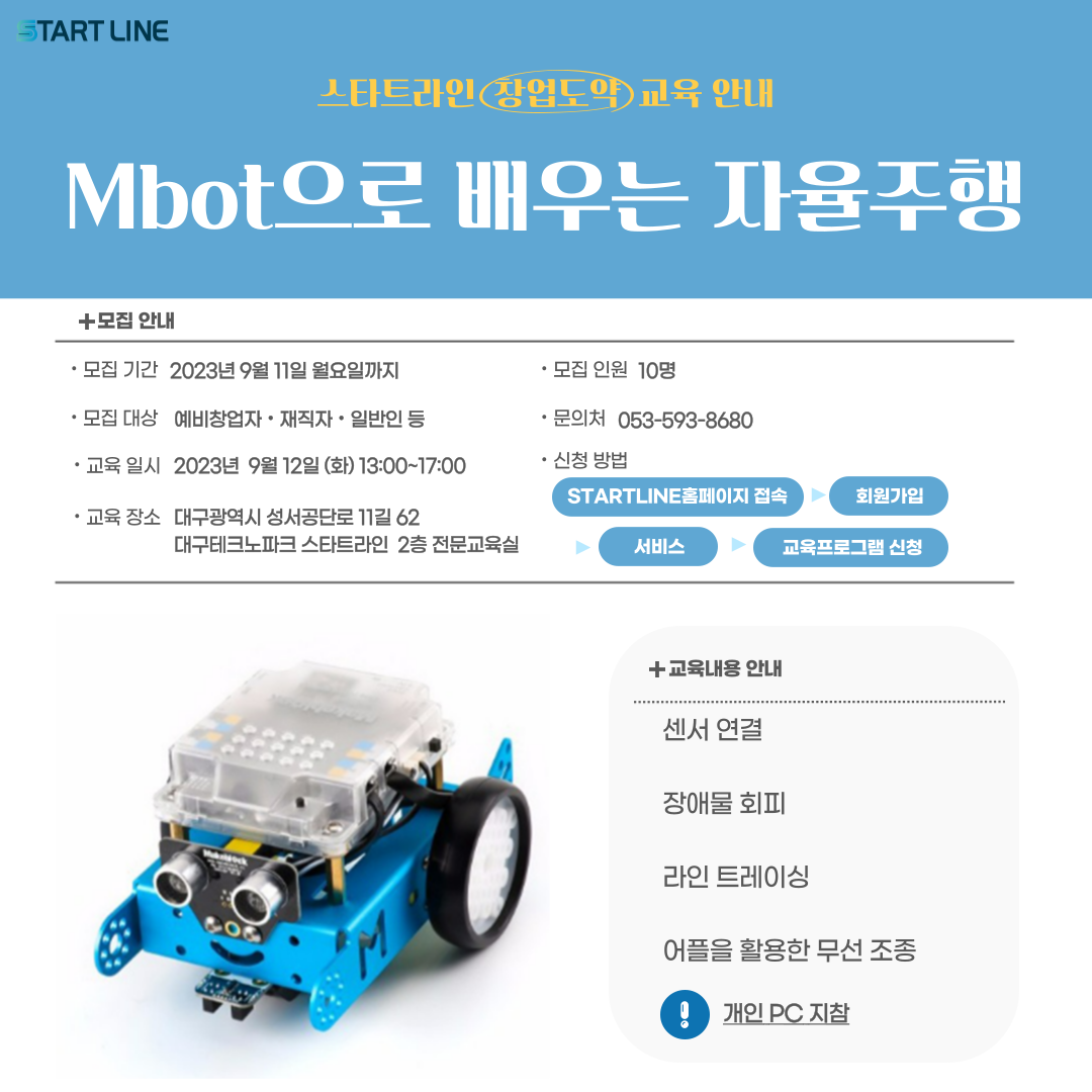 📢메이커스페이스 전문랩 스타트라인에서 'Mbot으로 배우는 자율주행' 교육을 진행합니다! 센서 연결과 어플을 활용한 무선 조종 교육이 진행 될 예정입니다.