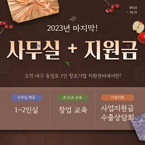 [ 사업지원금 + 사무실 제공 ] 대구 1인 창조기업 지원센터작성자 : 서주연 작성일 : 23-09-08