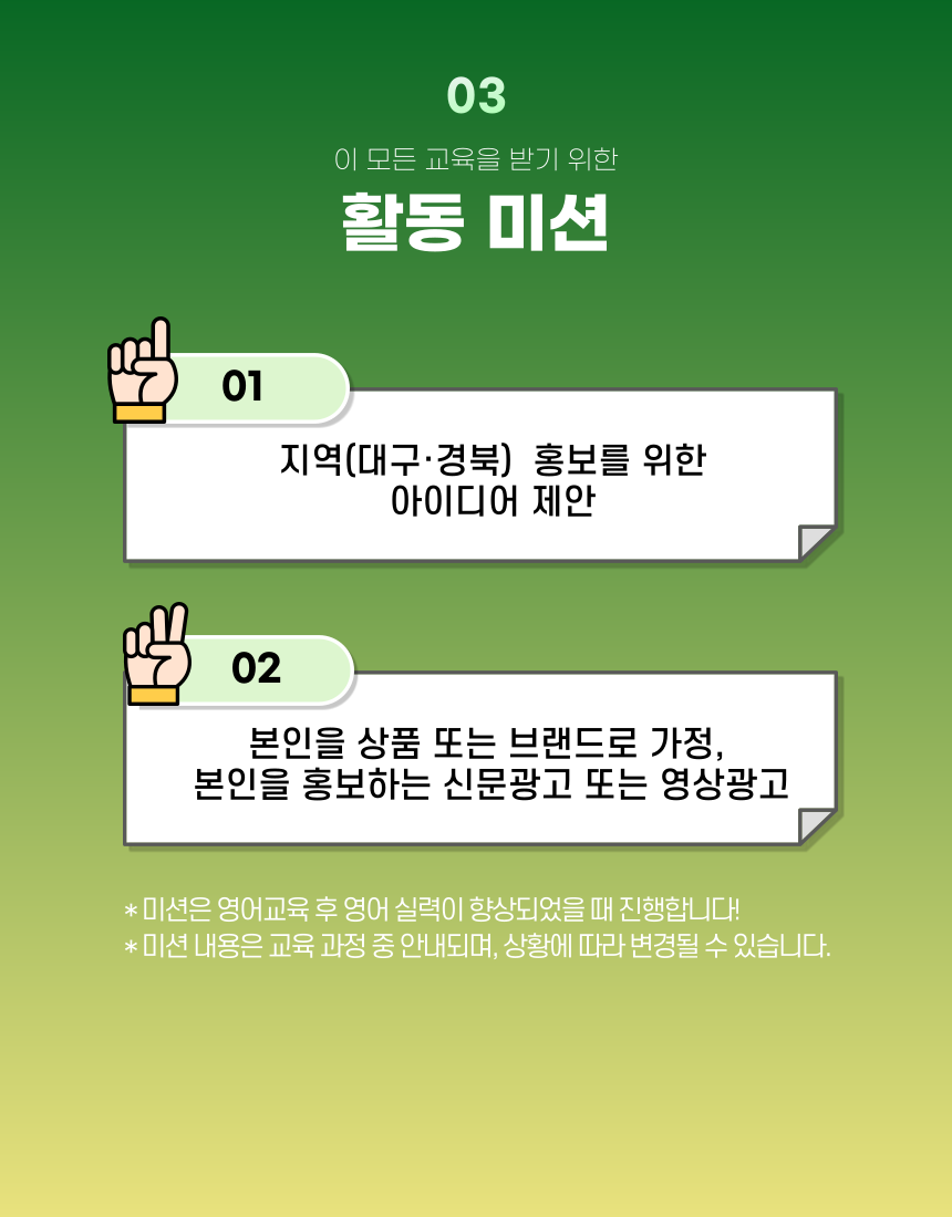 * 미션은 영어교육 후 영어 실력이 향상되었을 때 진행합니다.