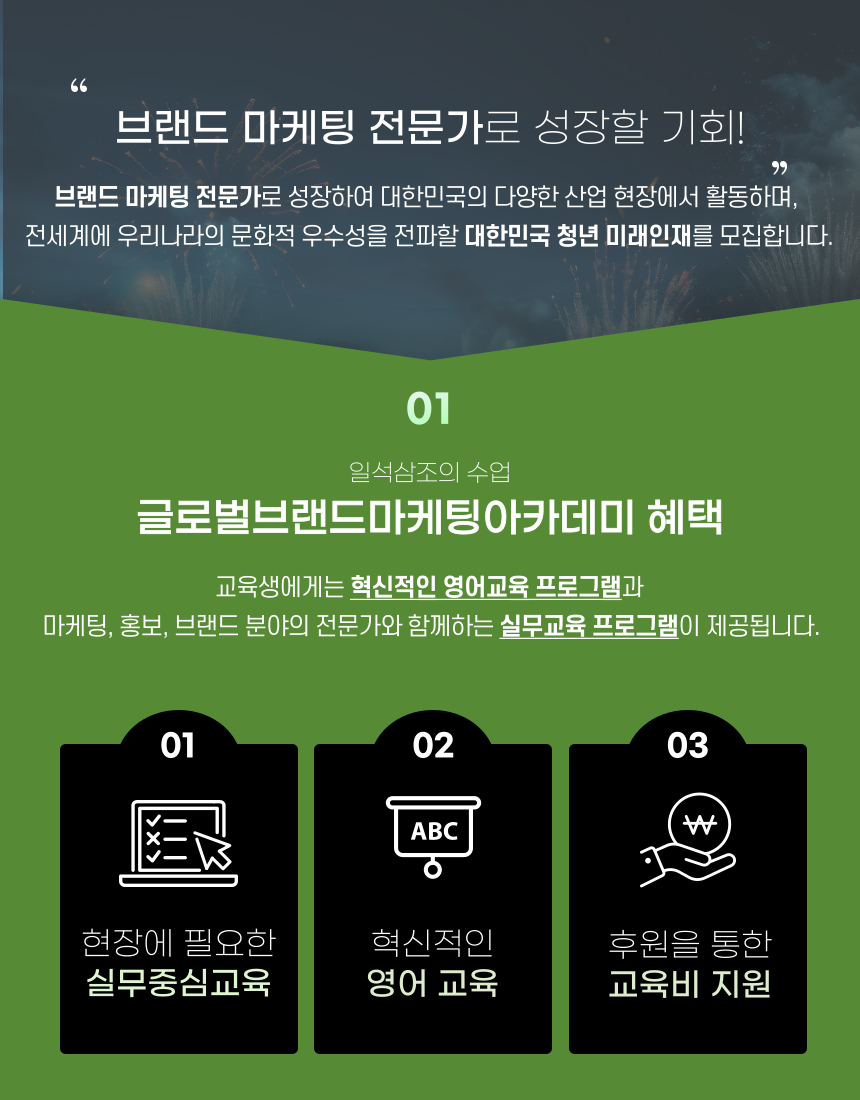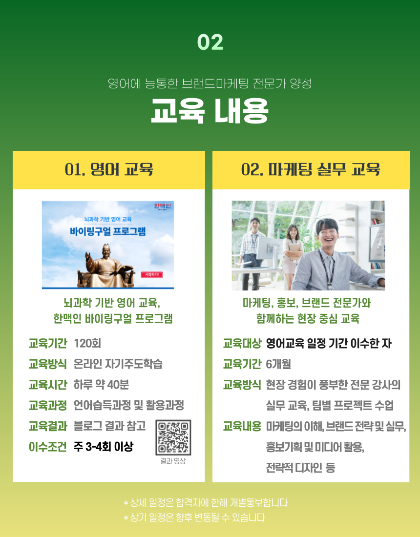: 영어 실력을 바탕으로 하는 브랜드마케팅 분야 인재를 양성하기 위함으로, 영어 교육을 일정 기간 이상 수강한 청년 중 선별을 통해 브랜드마케팅 전문 교육의 기회가 주어집니다.