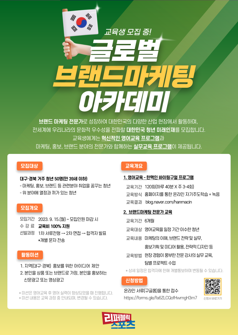 [교육비지원] 글로벌 브랜드마케팅 아카데미 1기 교육생 모집작성자 : 최경준 작성일 : 23-09-15