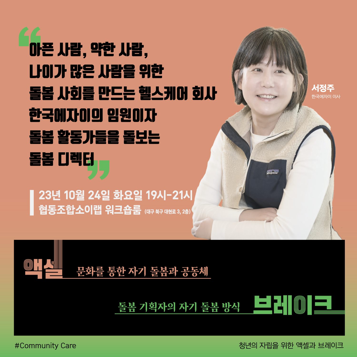 청년의 자립역량강화를 위한 <액셀과 브레이크>에 초청한 연사님들을 소개하는 포스팅을 이어서하고 있습니다. 이번에 소개해드릴 분은 헬스케어회사 한국에자이의 기업사회혁신부서 서정주 이사님을 소개합니다.