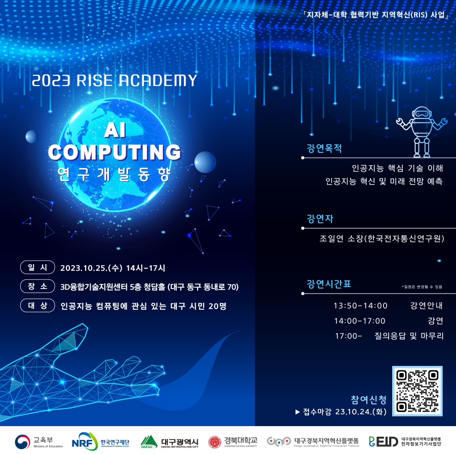 「지자체-대학 협력기반 지역혁신(RIS) 사업」의 일환으로 "2023년 「RISE 아카데미」 - 인공지능 컴퓨팅 연구개발 동향" 특강이 진행되오니 인공지능 컴퓨팅에 관심 있는 대구 시민들의 많은 참여 바랍니다.
