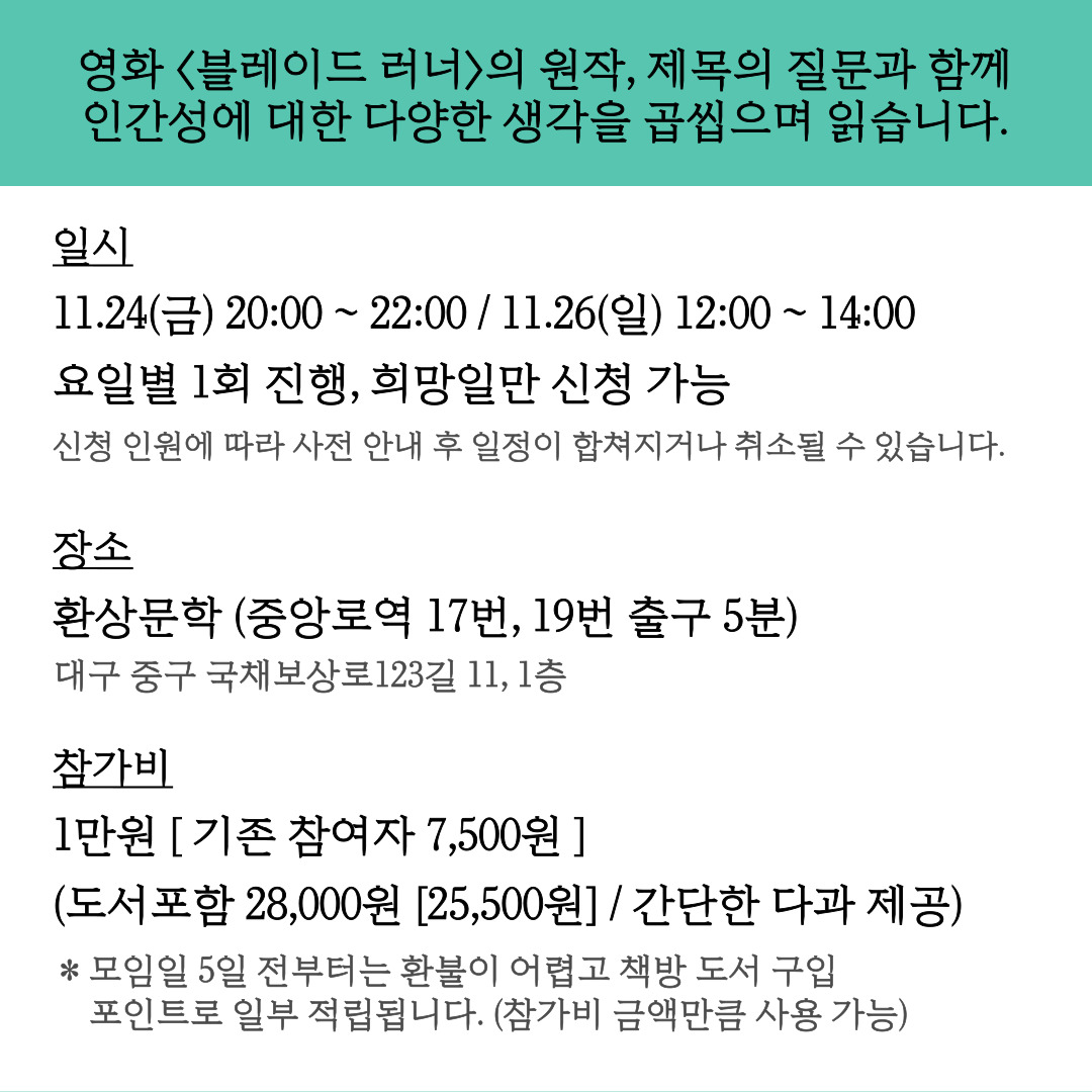 📚 한 달 동안 두 번의 만남을 통해 필립 K. 딕 저, <안드로이드는 전기양의 꿈을 꾸는가?>를 읽은 이야기를 나눕니다.