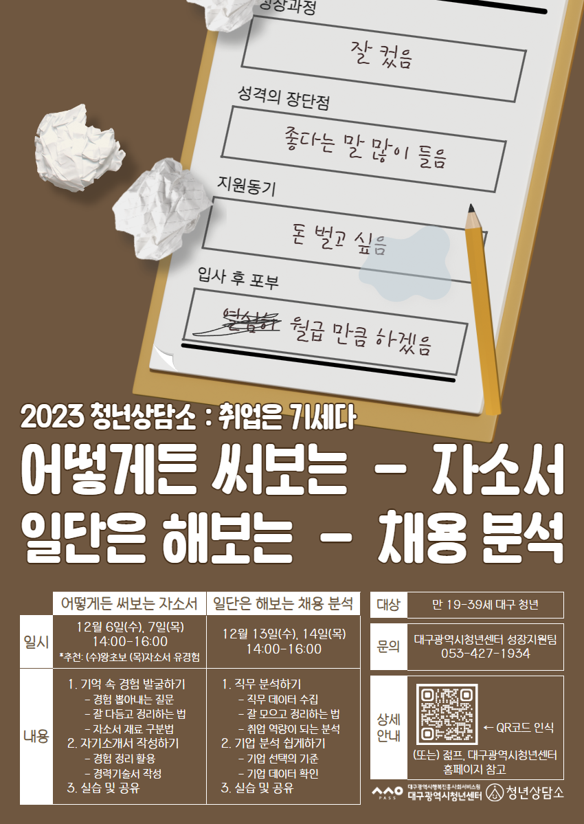 - 더 많은 참여 기회를 제공하기 위해, 대구광역시청년센터 청년상담소 진로/취업 상담 이력이 있을 경우 후순위에 배정될 수 있음을 양해 부탁드립니다.