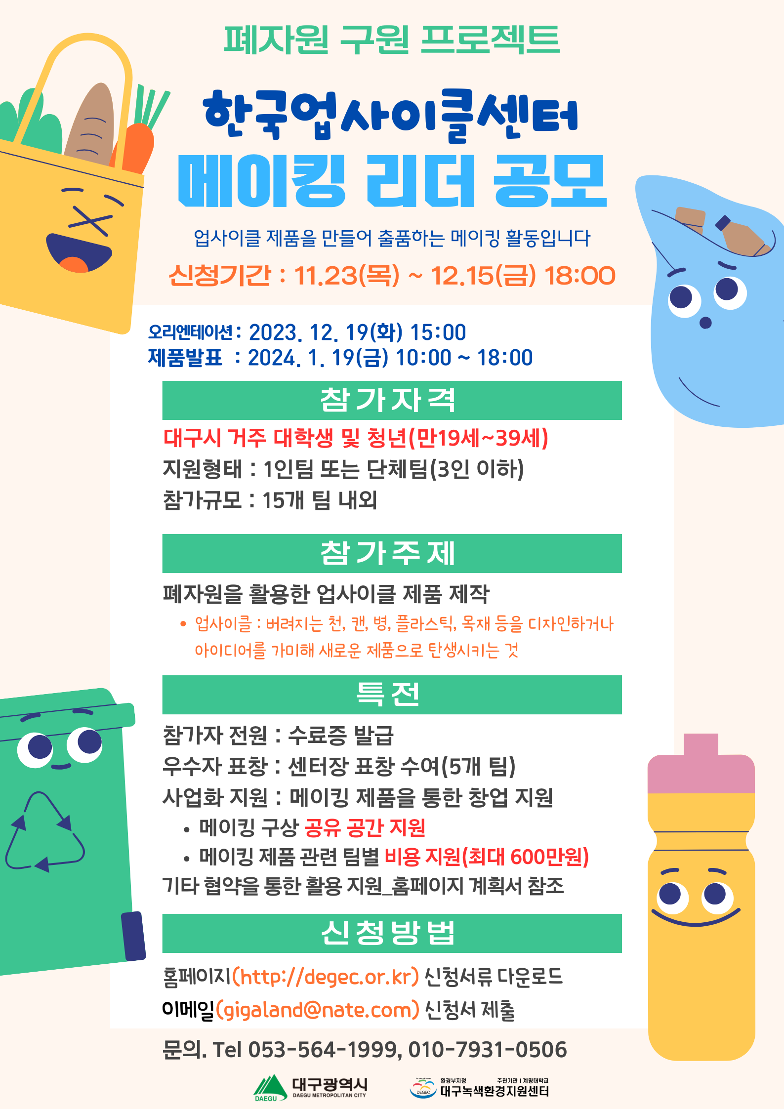 업사이클 제품 발굴 및 사업화 지원을 위한 ‘한국업사이클센터 메이킹 리더’ 참가자 모집을 아래와 같이 진행하오니 지역 청년들의 많은 참가 바랍니다.