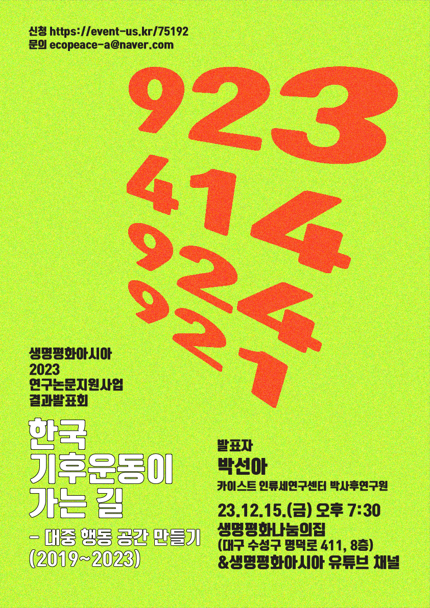 한국 기후운동의 지난 시간을 살피고, 앞으로의 길을 모색해 볼 수 있는 생명평화아시아 2023 연구논문지원사업 결과발표회에 많은 관심과 참석을 부탁드립니다.
