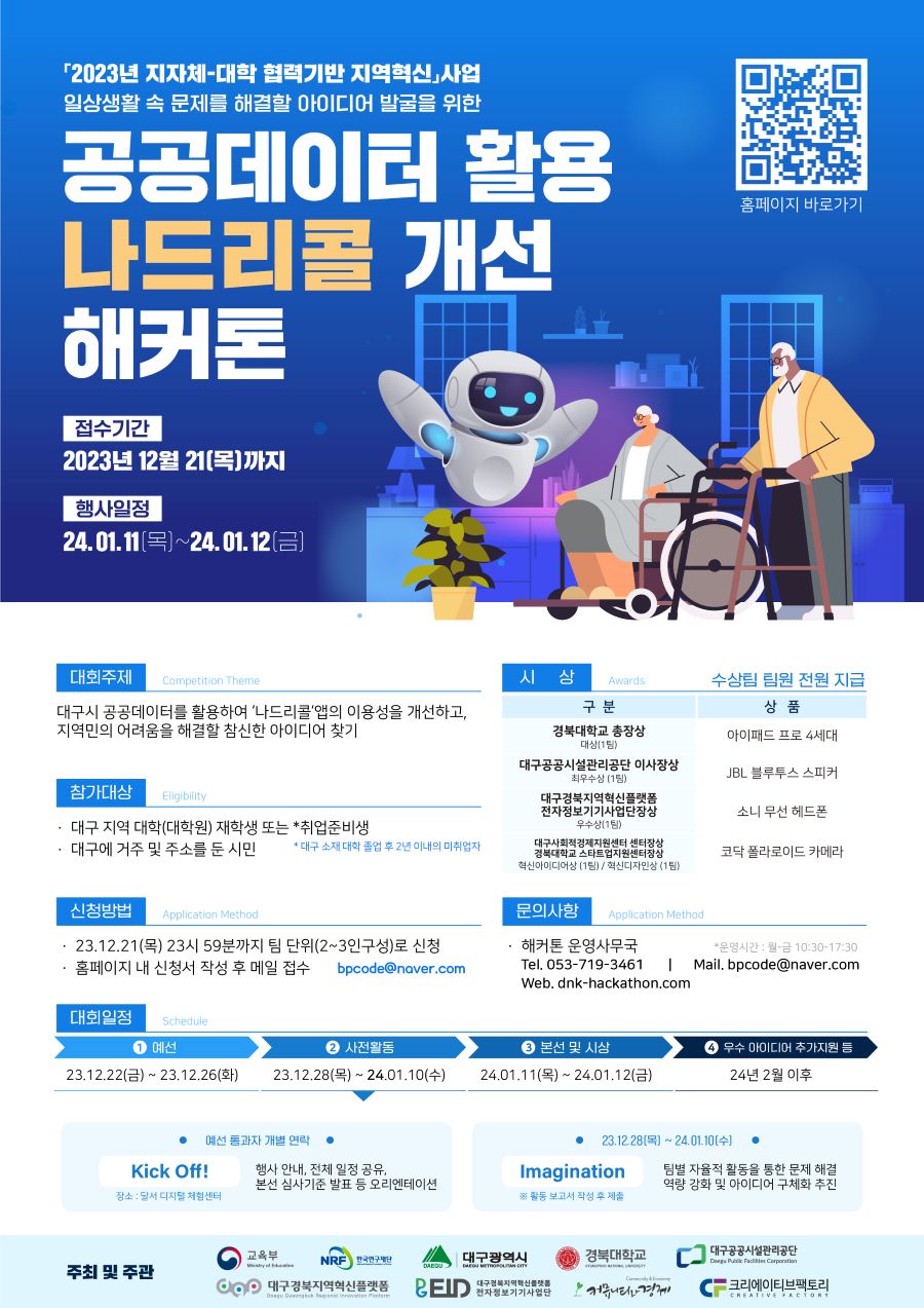 「지자체-대학 협력기반 지역혁신(RIS) 사업」의 일환으로 "공공데이터 활용 나드리콜 개선 해커톤"을 시행하오니 관심 있는 분들의 많은 참여 바랍니다.