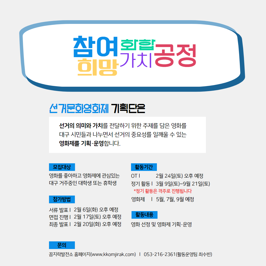선거문화영화제 기획단을 모집합니다!작성자 : 최수빈 작성일 : 24-01-02