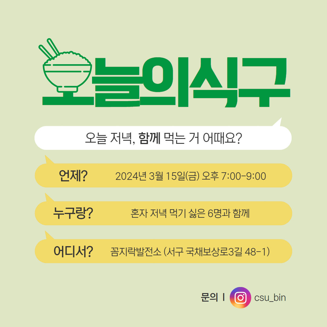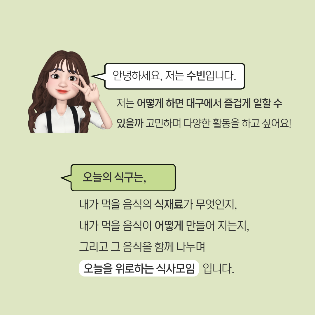 오늘을 위로하는 식사 모임 [오늘의 식구]작성자 : 최수빈 작성일 : 24-02-29