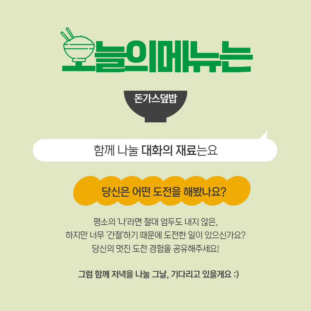 세번째 나눌 음식은 [돈가스덮밥&상추겉절이], 나눌 대화는 [당신은 어떤 도전을 해봤나요?] 입니다.